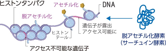 変換されたNAD+は、サーチュイン遺伝子産物と関わりながら、NAD+依存性ヒストン脱アセチル化酵素の働きに関与することが研究で示されており、遺伝情報の制御や細胞機能の維持に関わる要素の一つとして注目されています。