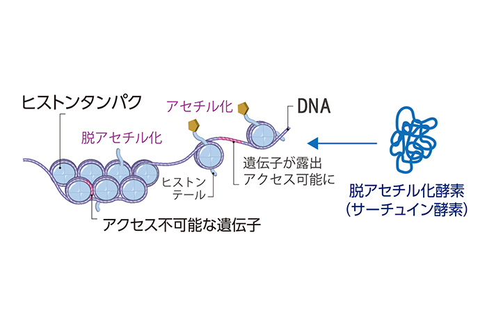 そして、EPI GENOME Lineシリーズの先発製品は、近年注目を集めているNicotinamide Mono Nucleotide(NMN:エヌ・エム・エヌ)含有するサプリメント製品です。NMN自体の特長は、体内に吸収されると速やかにNicotinamide Adenine Dinucleotide(NAD+:ナッド)に変換される点です。そののちに変換されたNAD+がサーチュイン遺伝子産物と共に「NAD+依存性ヒストン脱アセチル化酵素」として機能することで、遺伝情報のエラー制御に関与することが研究で解明されています。