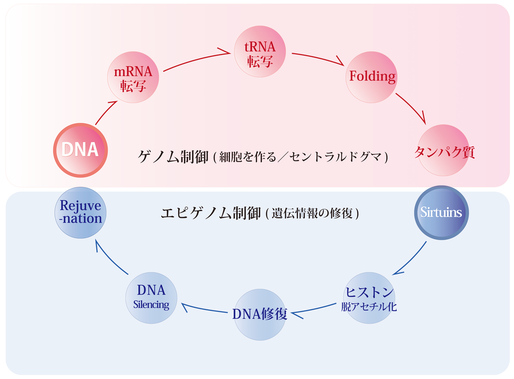 遺伝子DNAの塩基配列、すなわち「ゲノム(GENOME)」は、生命の「基本設計図」として細胞構造の生成やタンパク質合成に直接関わっています。一方で、「エピゲノム(EPIGENOME)」は遺伝子に付与される「化学修飾」であり、DNAの転写制御に影響を与えます。2019年には、私たちの研究チームの藤林万里子と宇野克明という両研究医が、この二つの相互作用に着目し、「GENOME/EPIGENOMEサイクル」という新たな概念を初めて提唱しました。そしして、この概念の提唱をきっかけに、新たな若返りの総合対策として、「NEO AGING(ネオエイジング)」の研究が始まったのです。